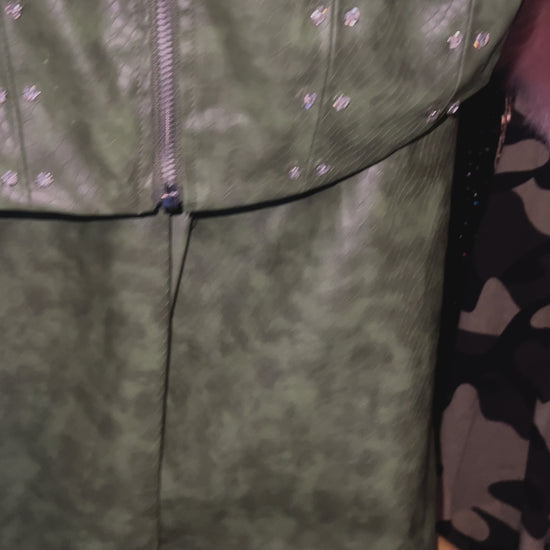 Indulge in a daring piece with our Martini Olive Leather Set. Crafted from supple olive green leather, this two piece set exudes sophistication and style. Each piece is adorned with delicate studs, adding a touch of elegance to any outfit. Elevate your fashion game with this exclusive set.
